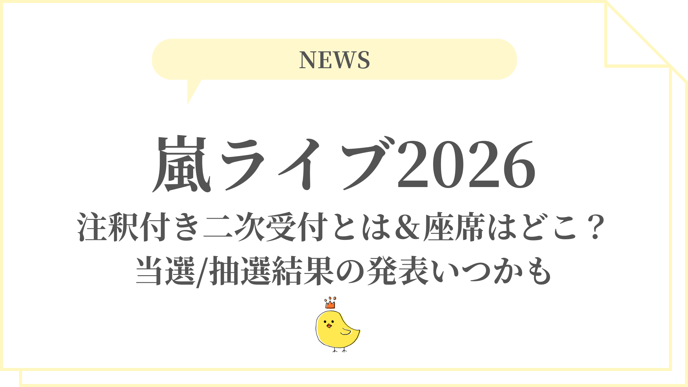 嵐のラストツアー「ARASHI LIVE TOUR 2026「We are ARASHI」」で話題の「注釈付き二次受付」が気になりますよね。ファンクラブ一次先行で落選した人向けの追加チャンスで、機材席など視界制限付きの特別枠が特徴です。5大ドーム15公演の激戦の中で、この二次受付の詳細を知りたいファン続出中。