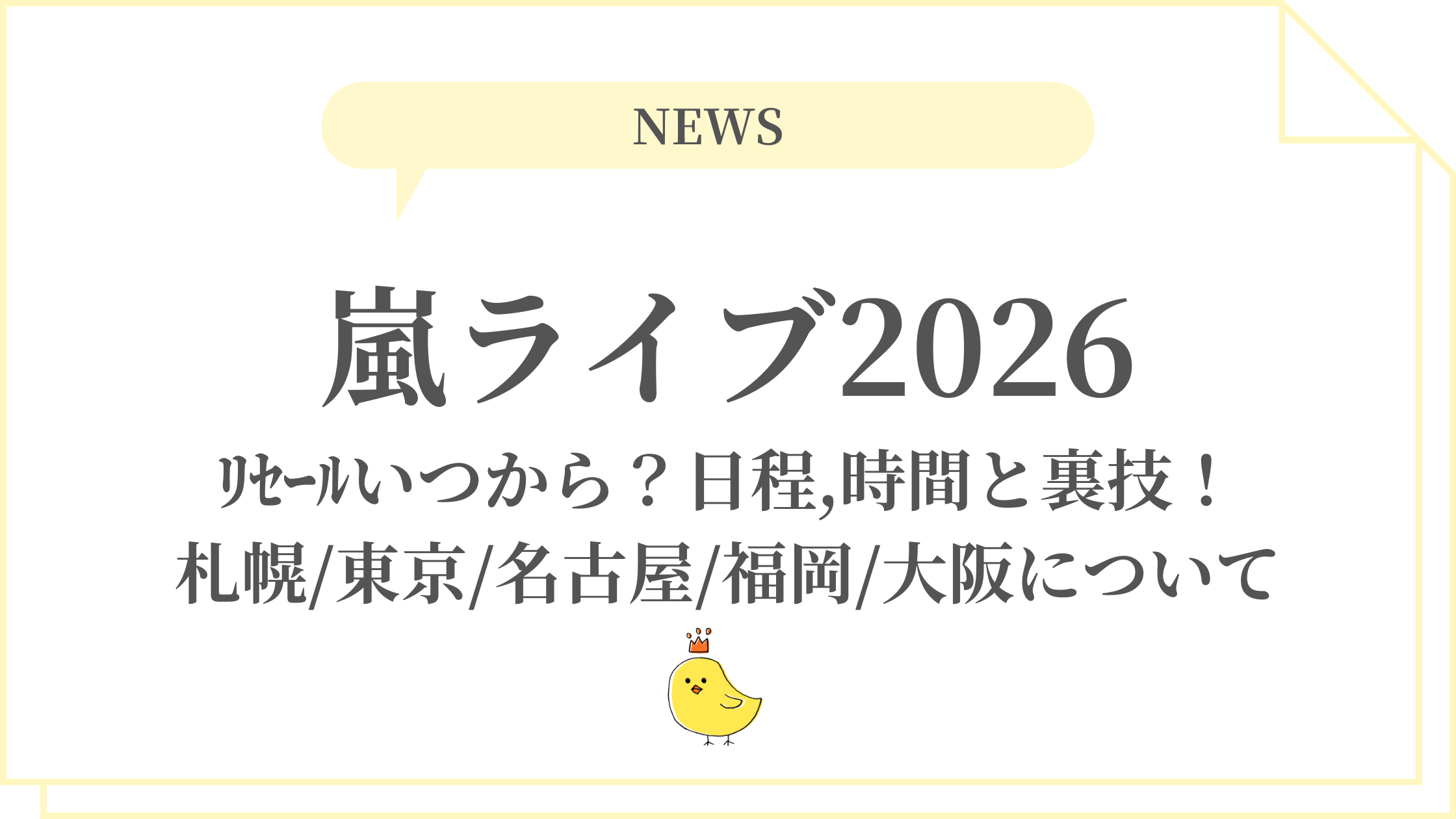 嵐のラストツアー「ARASHI LIVE TOUR 2026「We are ARASHI」」が話題沸騰中です。2026年3月〜5月にかけて、札幌・東京・名古屋・福岡・大阪の5大ドームで全15公演が行われ、5月31日東京ドームが感動のファイナル。ファンクラブ先行抽選の当落が出た今、リセール情報が一番の注目ポイントです。