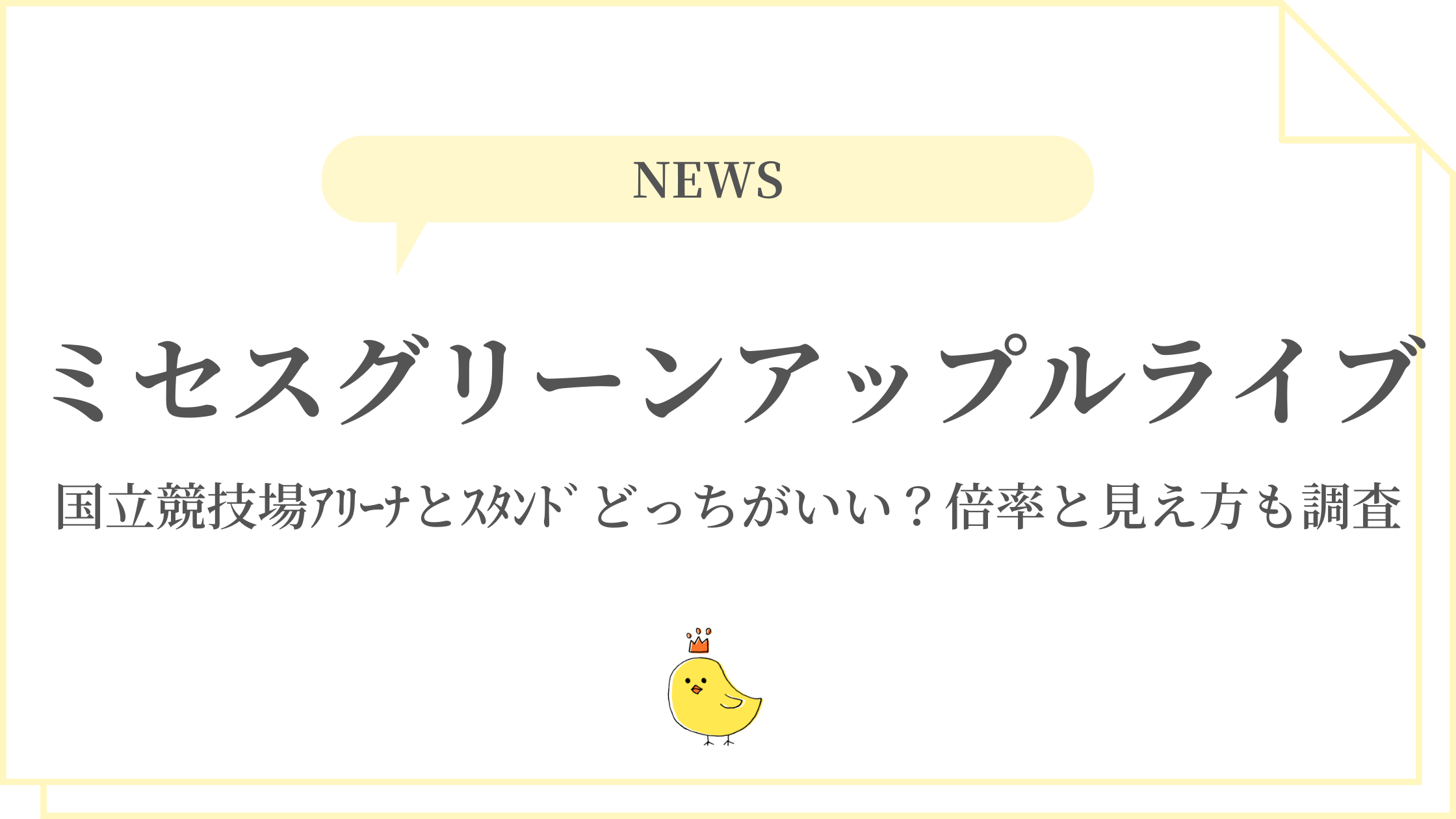 ミセス2026国立競技場はアリーナ(表情・音圧最強、倍率25-40倍)とスタンド(快適・一体感、倍率3-12倍)の二択勝負です。アリーナ前半は神席(18,000円)、スタンド1階が家族最強(12,000円)、3階はコスパ王(8,000円)。